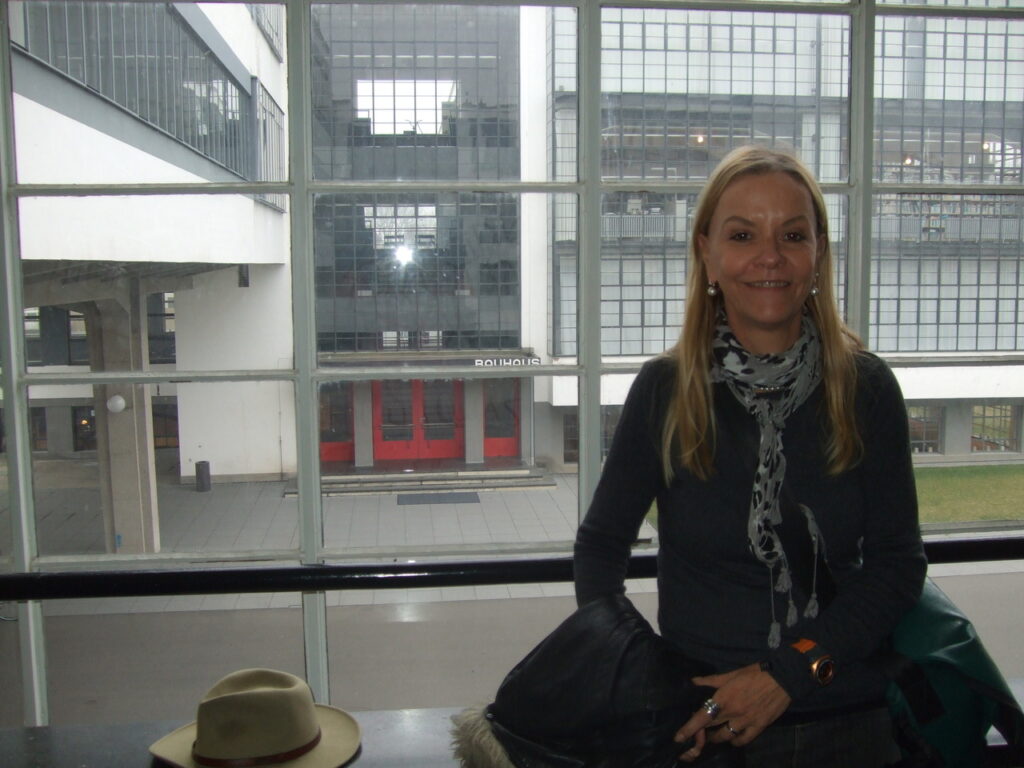 Aproximando-me do prédio, arquitetura de Walter Gropius que foi também seu primeiro diretor, pude avaliar como as pessoas de 1926 ficaram surpresas com a construção que eu via. Toda aquela sua moderna arquitetura foi pensada na função que desempenharia. A porta vermelha com o nome em branco acima impressiona. A fachada envidraçada da escola; estruturas de aço aparente; uso das cores nas paredes com linguagem ou orientação visual em todos os andares. Além de identificar os andares dos prédios, as cores internas ajudam a ampliar ambientes, escurecê-los ou refletir a luz; cabos suspensos com pequenas lâmpadas dispostas assimetricamente na direção do anfiteatro; o teatro de Oscar Schlemmer, o teatro total, com bastidor retrátil que permite que o espetáculo seja apreciado de todos os ângulos. Detalhes funcionais das portas, das janelas etc. geraram em mim um forte impacto.
